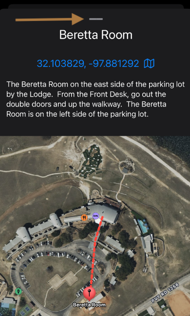 Clicking on a location icon will show the details for that location. Most detail pages include directions from the front desk to that location.